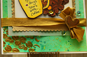 For the background I used some watercolors in various shades of green and then splattered on some more green and of course sprayed on some gold Color Shine!  I added gold texture paste coffee beans with a stencil.  These colors make me feel like Summer!  The pretty green grass and the yellow sun and some people's golden skin...lol... although my skin remains a bit pasty usually; in part because I'm inside making cards a lot while it's 120 out and also when I am out... sunscreen, sunscreen, sunscreen!